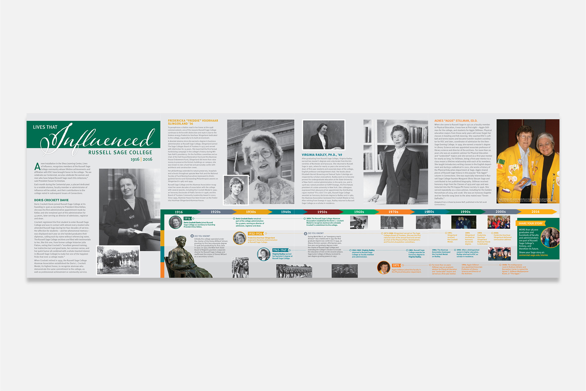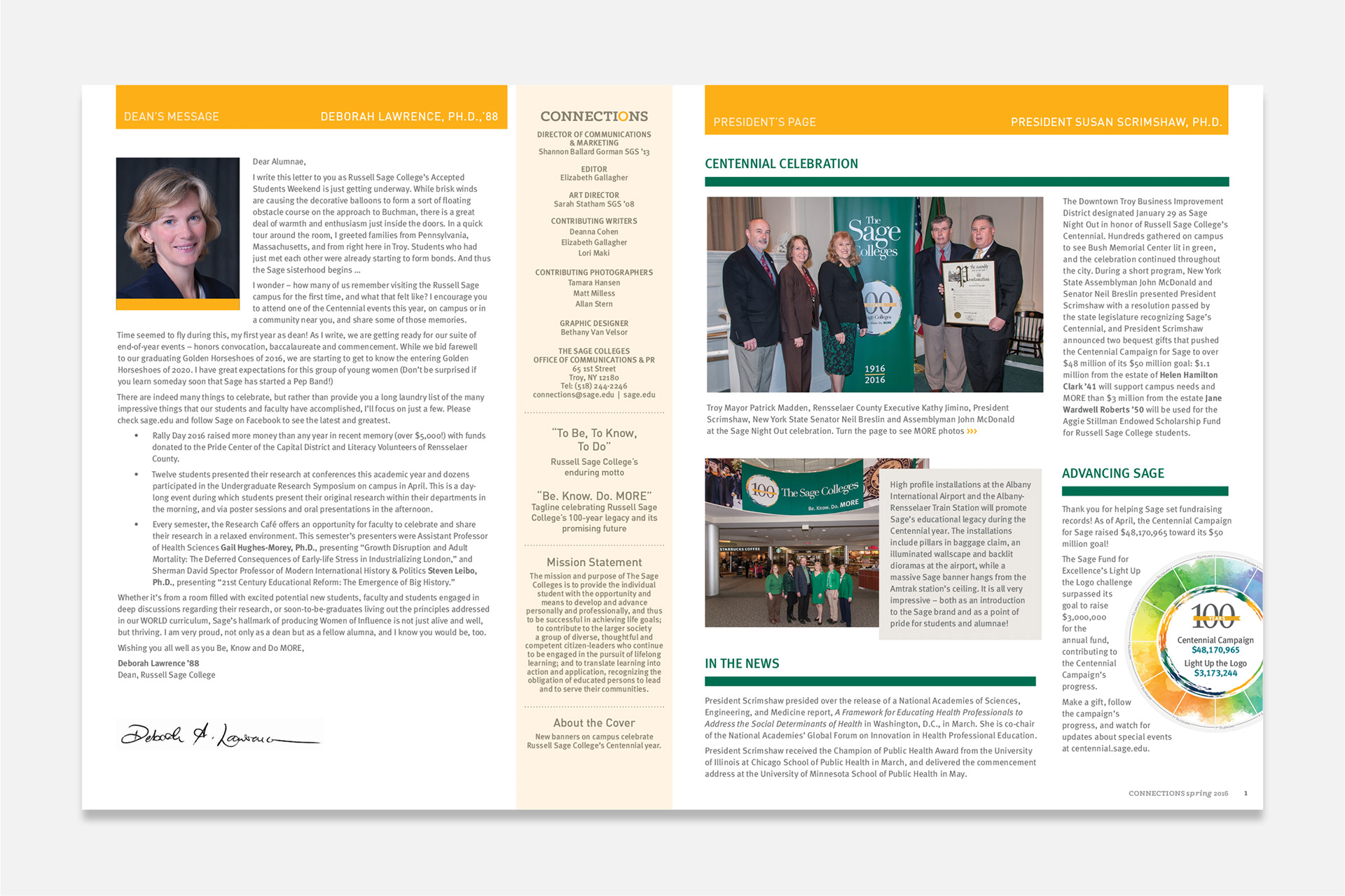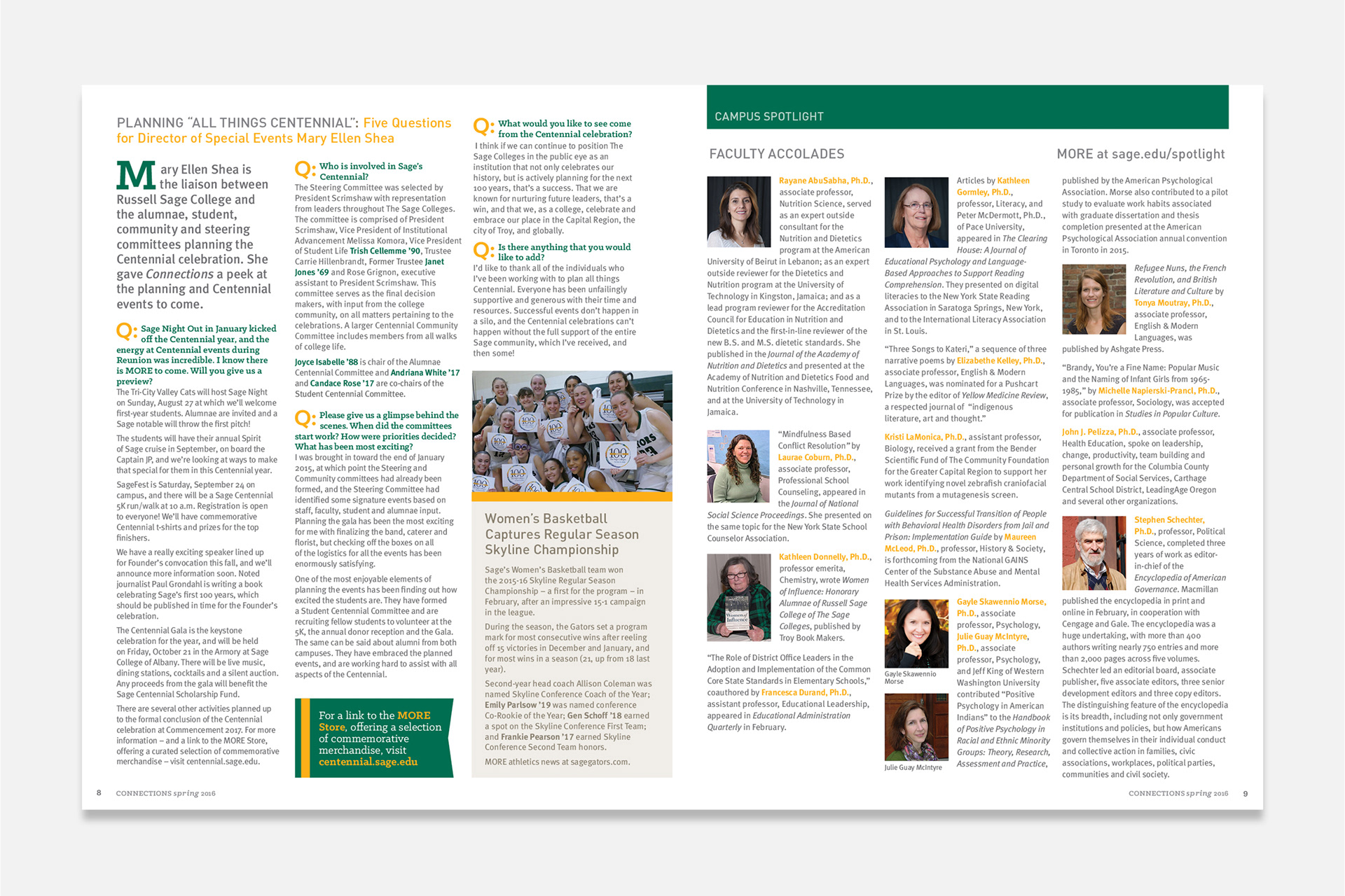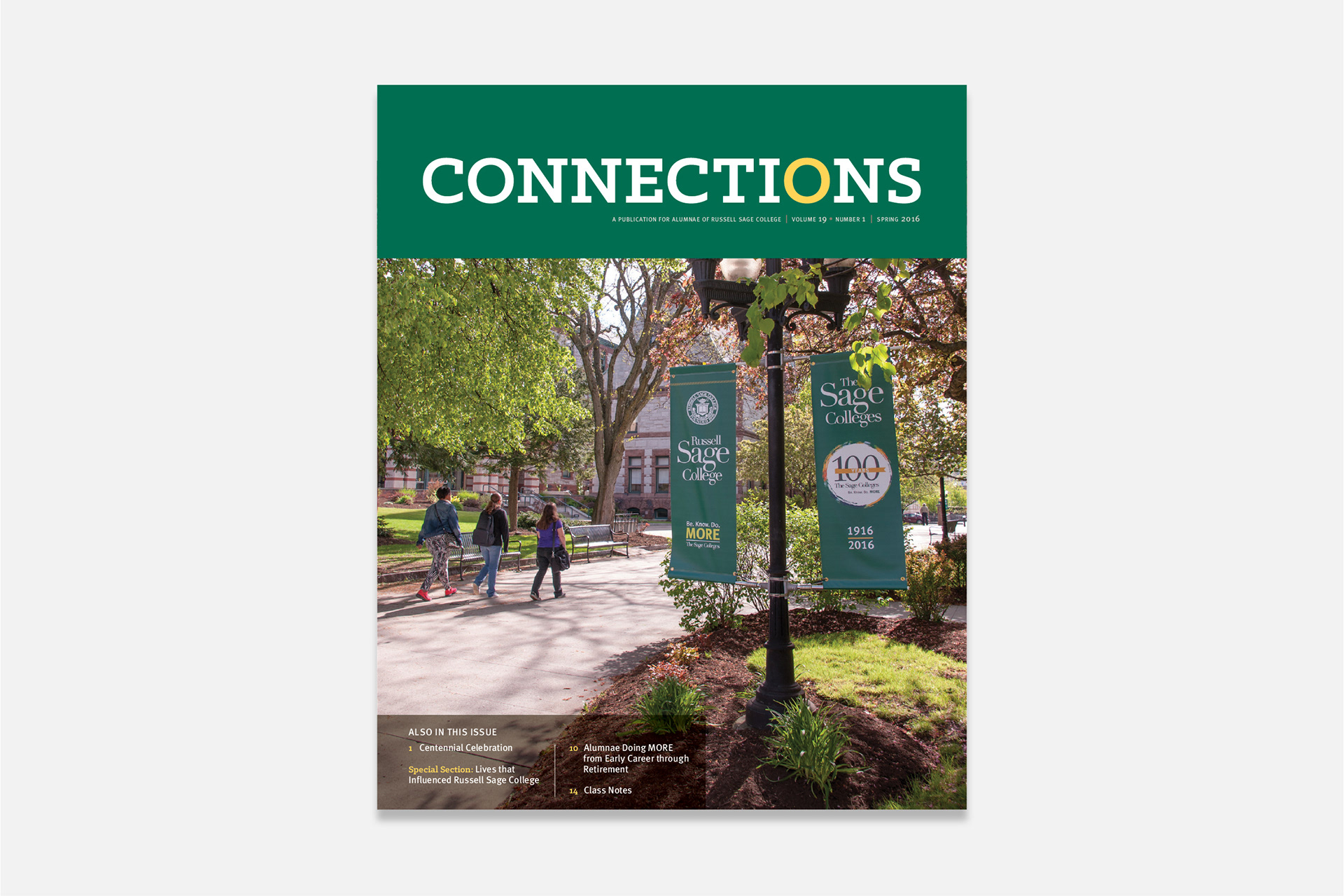 A publication for alumnae of Russell Sage College. Published during Russell Sage College's Centennial celebration, this issue included a special fold out section to highlight notable alumnae and a timeline of Russell Sage College.