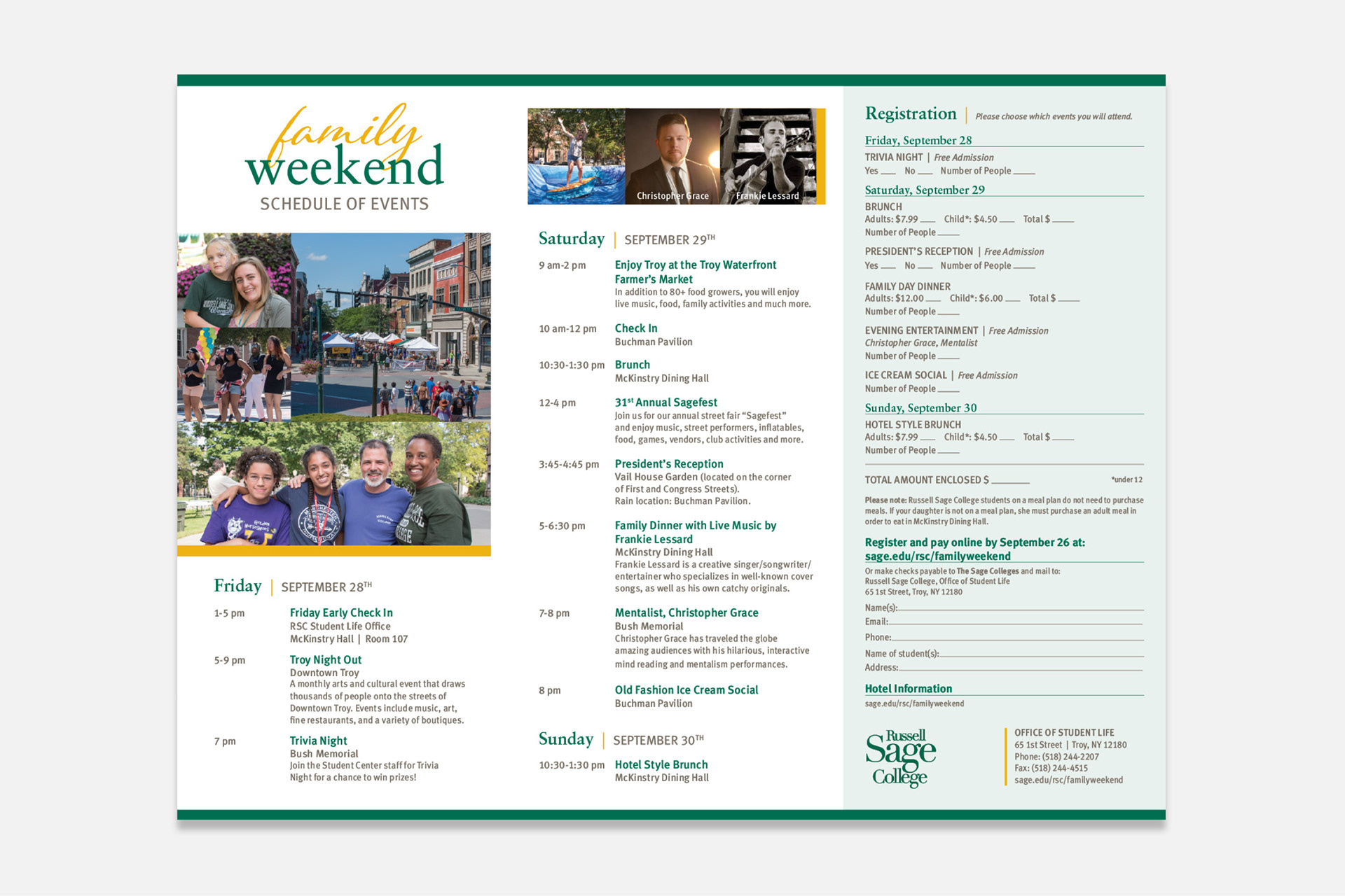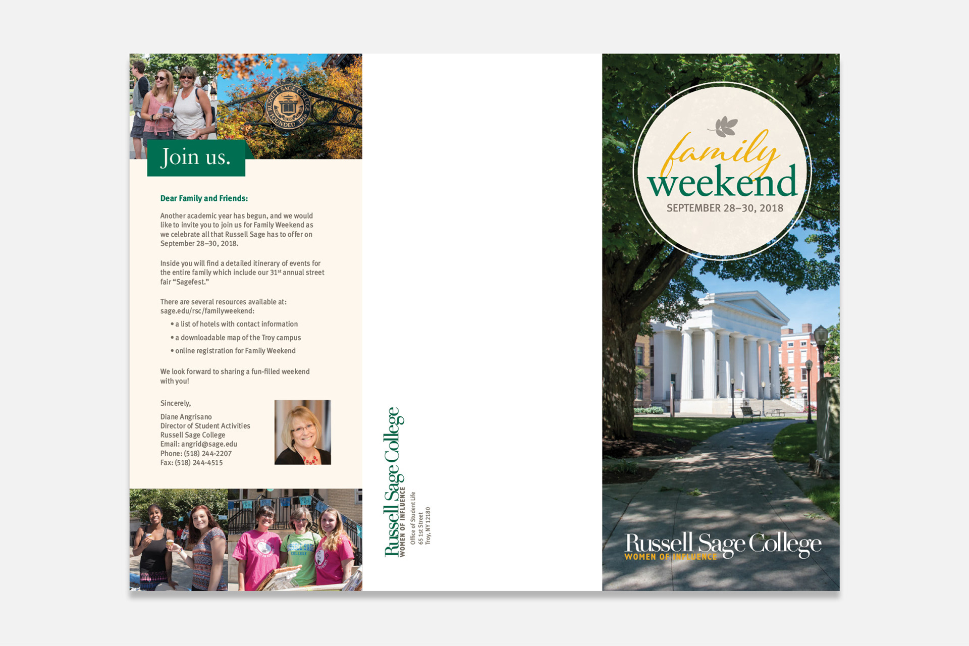 Trifold mailer created for the Office of Student Life at Russell Sage College.