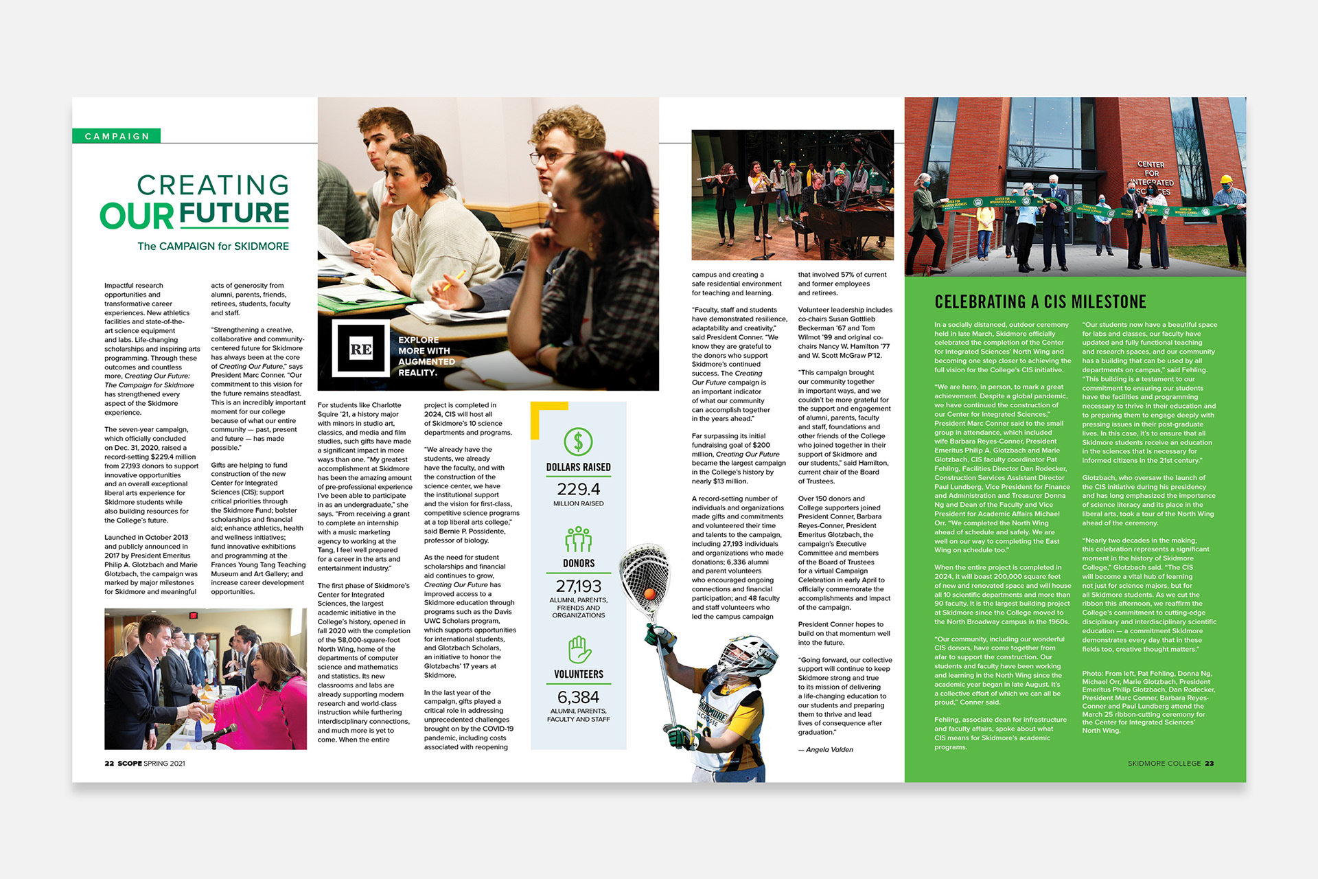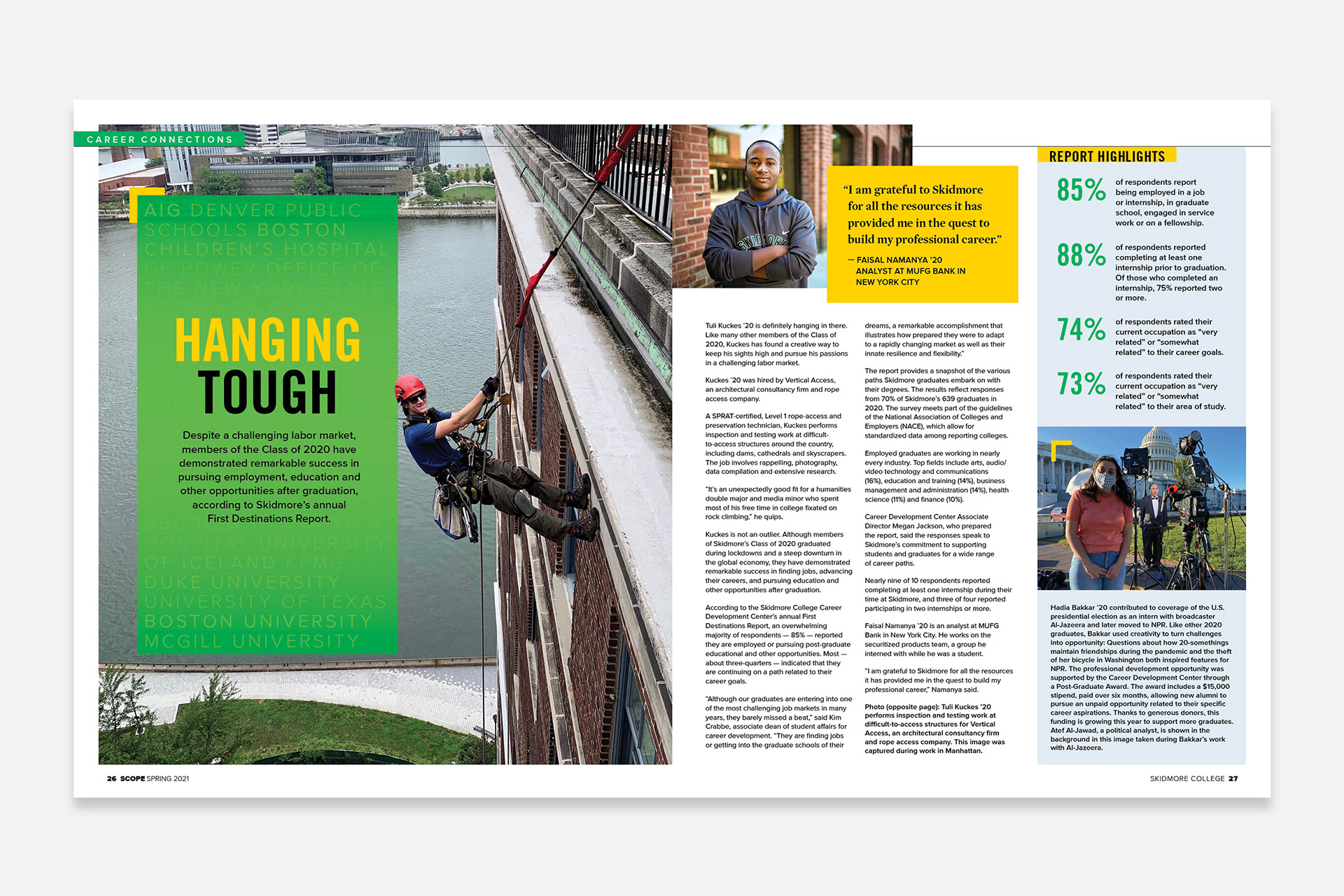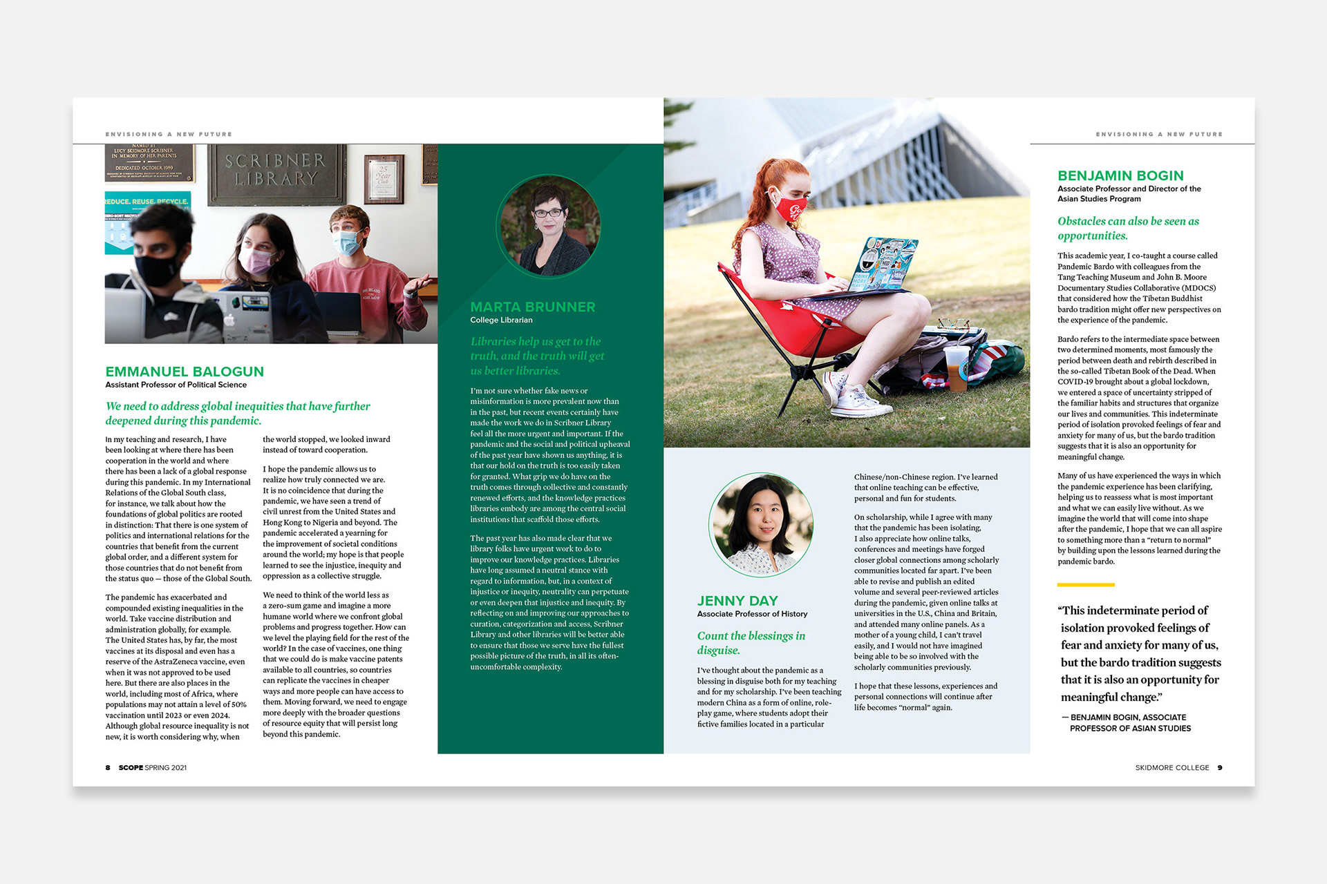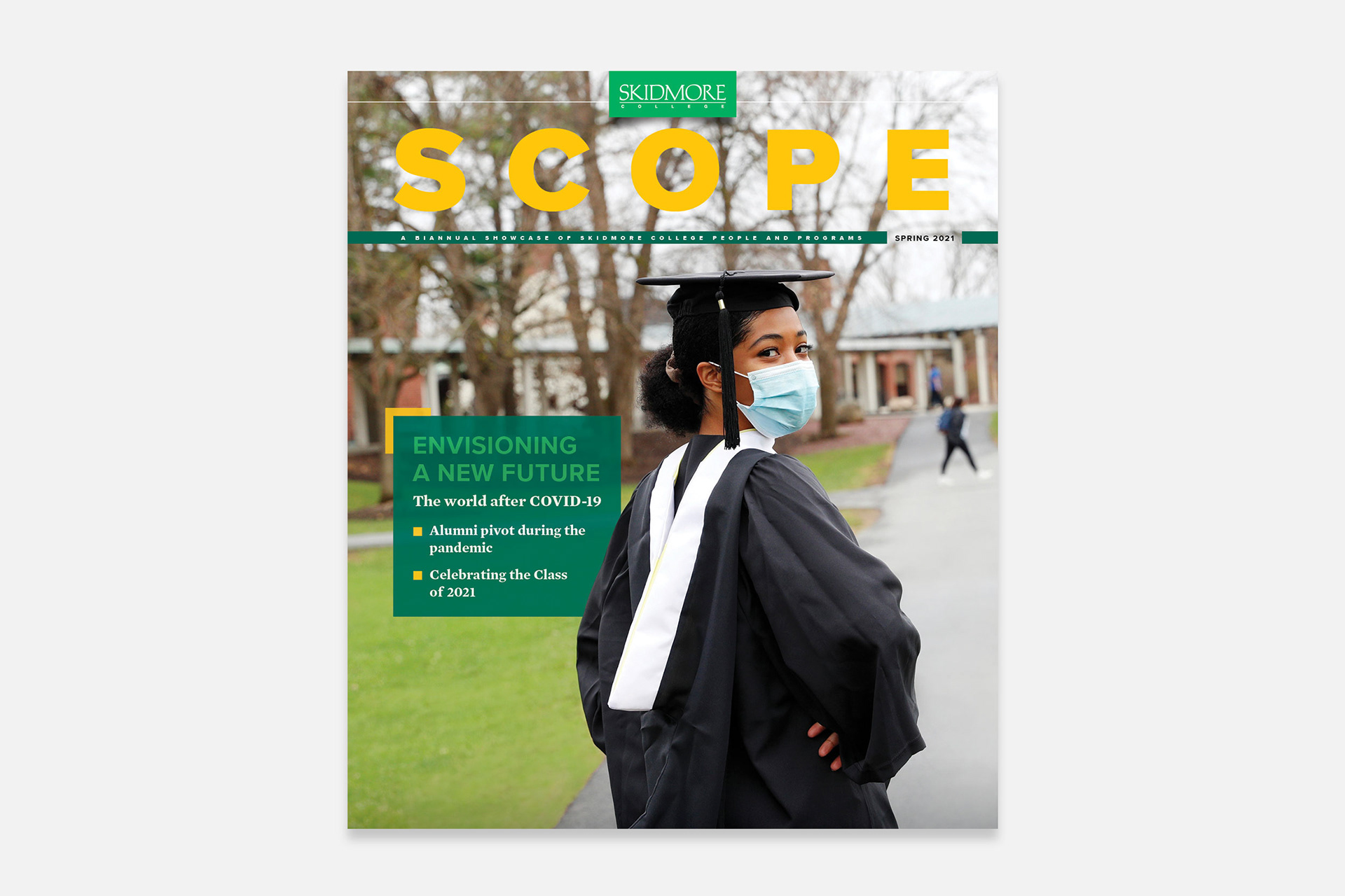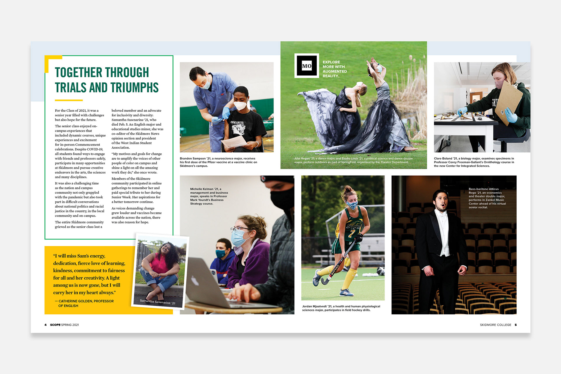 Selected spreads from the Spring 2021 issue of Scope, Skidmore's Alumni Magazine.